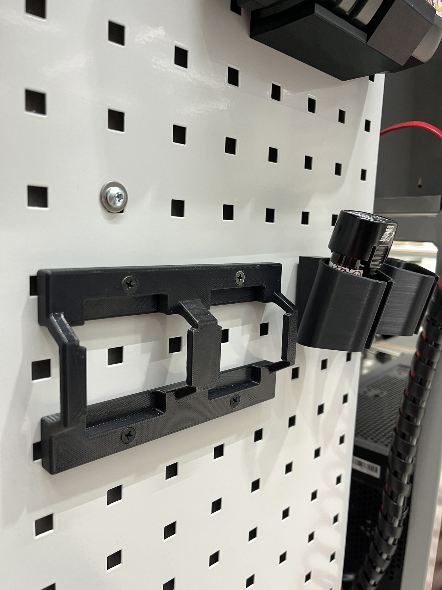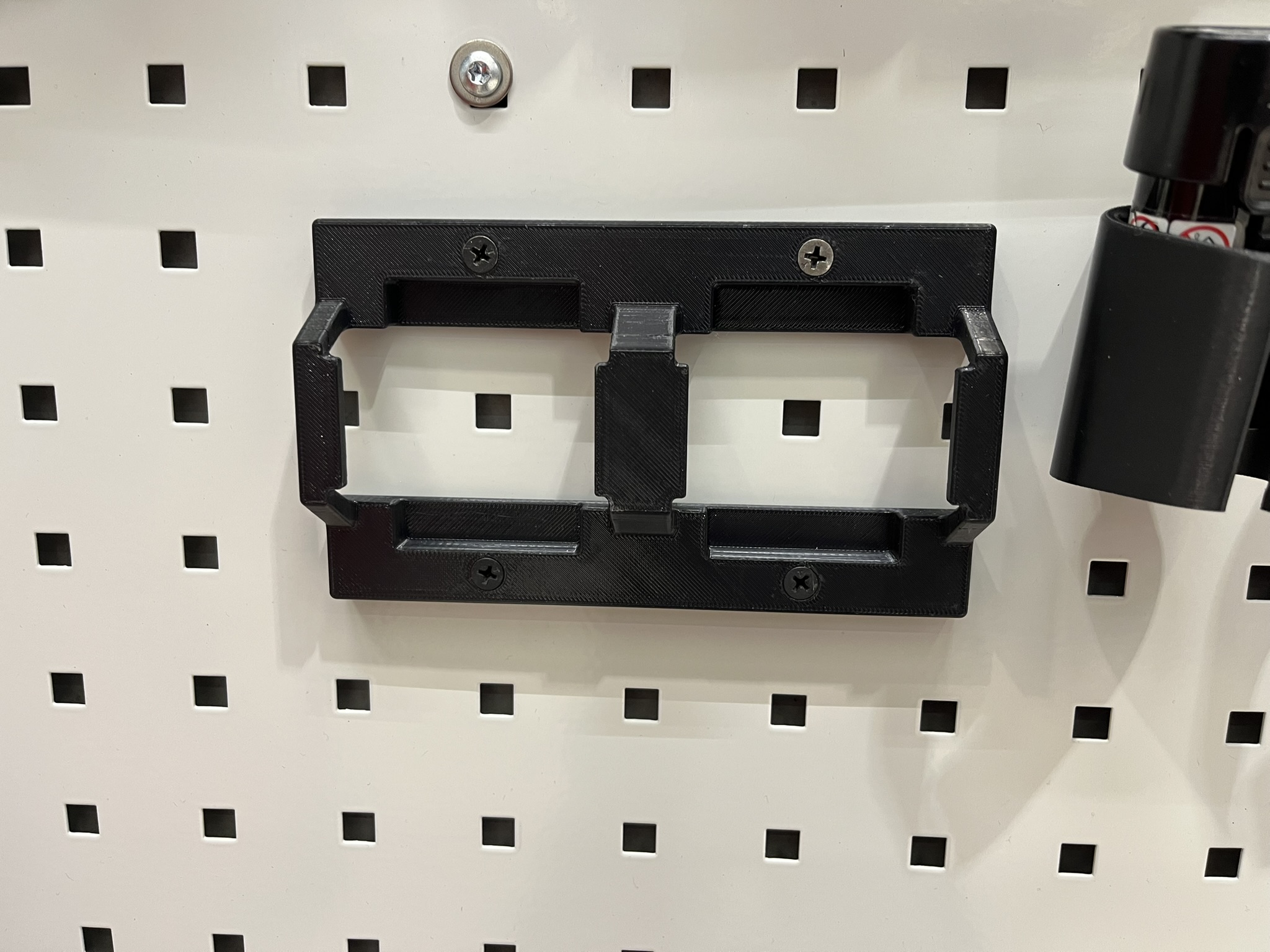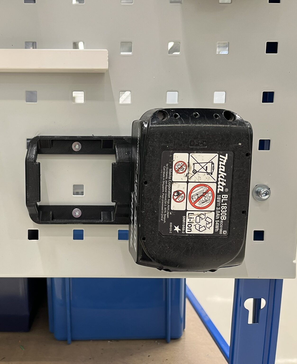 3D-printed battery holder for Makita LXT batteries. Mounting holes are designed to fit standart pegboard hole dimensions 9×9 mm and hole distance c/c 38 mm. Ideal for home or workshop use. The holder is designed to fit two batteries and as it makes use of the locking mechanism from the battery they can be mouned in any orientation.